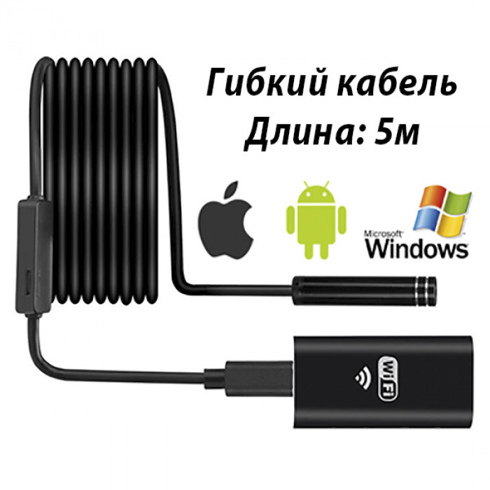 Ендоскоп підключається через Wi-Fi до смартфонів і планшетів або за допомогою USB-кабелю до комп’ютера. На відміну від звичайних microUSB-ендоскопів без Wi-Fi, які не працюють на більшості пристроїв, ця модель стабільно працює з Android, iOS, Windows та Mac.